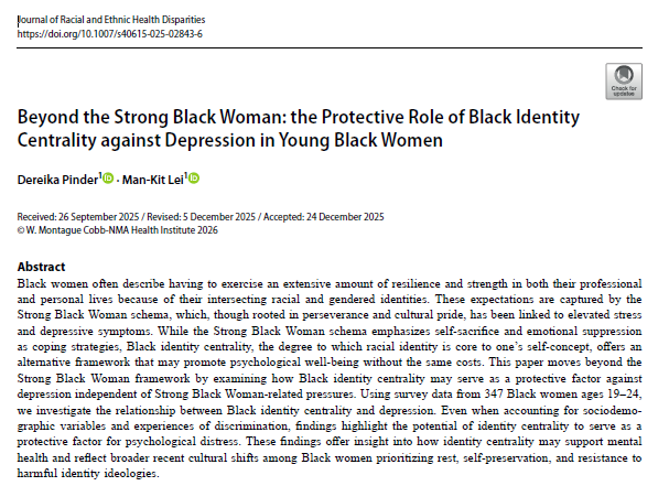 Congratulations to our graduate student Dereika Pinder (first author) and co-author Dr. Karlo Lei, on a new article published in the Journal of Racial and Ethnic Health Disparities: “Beyond the Strong Black Woman: The Protective Role of Black Identity Centrality against Depression in Young Black Women.” Abstract: Black women often describe having to exercise an extensive amount of resilience and strength in both their professional and personal lives because of their intersecting racial and gendered identities. These expectations are captured by the Strong Black Woman schema, which, though rooted in perseverance and cultural pride, has been linked to elevated stress and depressive symptoms. While the Strong Black Woman schema emphasizes self-sacrifice and emotional suppression as coping strategies, Black identity centrality, the degree to which racial identity is core to one’s self-concept, offers an alternative framework that may promote psychological well-being without the same costs. This paper moves beyond the Strong Black Woman framework by examining how Black identity centrality may serve as a protective factor against depression independent of Strong Black Woman-related pressures. Using survey data from 347 Black women ages 19–24, we investigate the relationship between Black identity centrality and depression. Even when accounting for sociodemographic variables and experiences of discrimination, findings highlight the potential of identity centrality to serve as a protective factor for psychological distress. These findings offer insight into how identity centrality may support mental health and reflect broader recent cultural shifts among Black women prioritizing rest, self-preservation, and resistance to harmful identity ideologies.